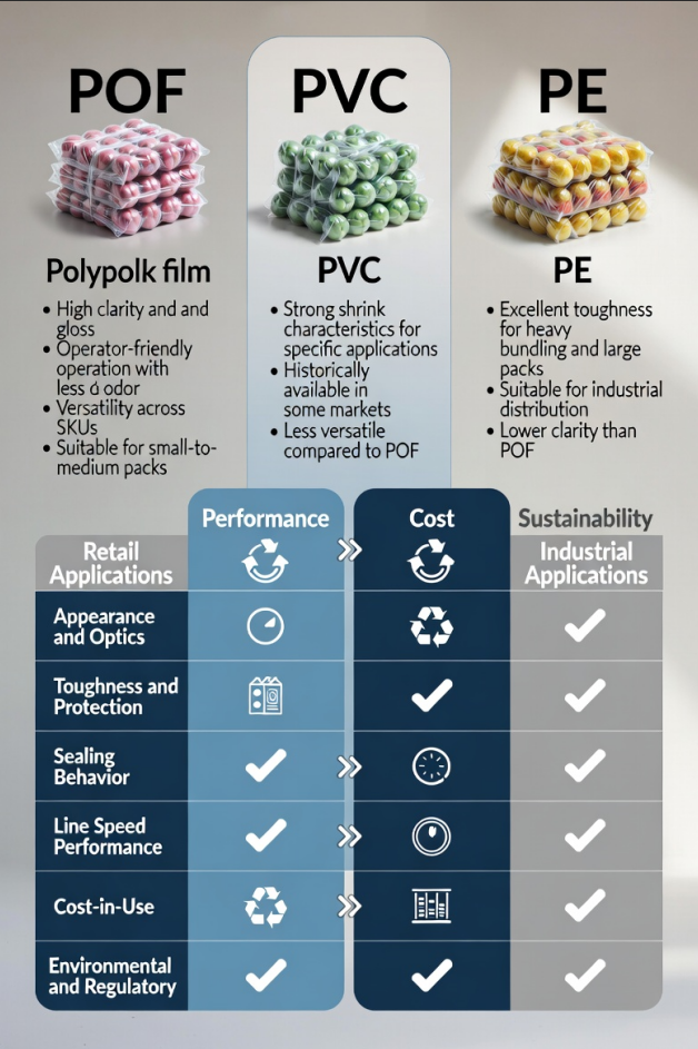 El POF a menudo se compara con el PVC y el PE porque esos materiales cubren la mayoría de las aplicaciones de contracción en todo el mundo. La mejor elección depende del equilibrio que necesita entre apariencia, dureza, comportamiento de sellado, costo de uso y percepción/regulación.